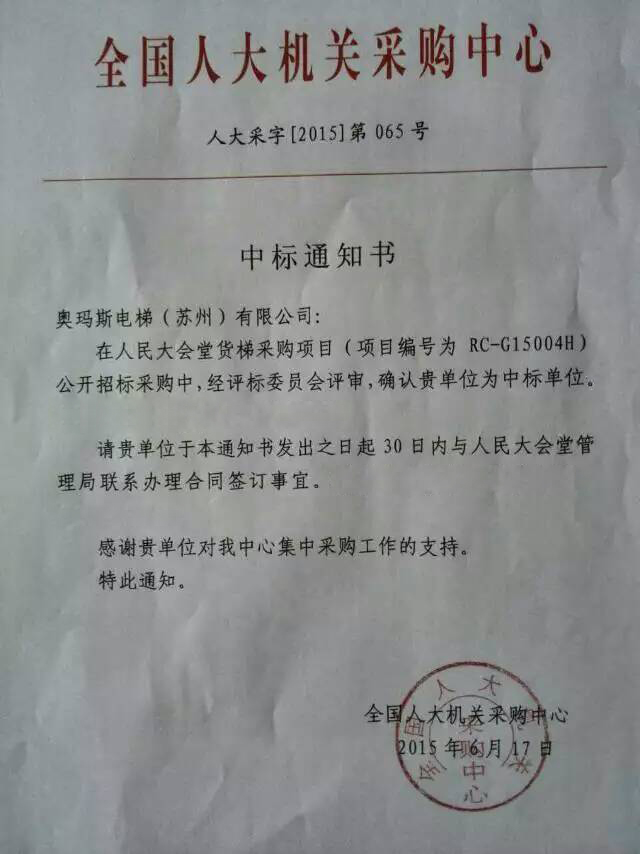 2015年6月17日,对于开云·电子(中国)官方网站电梯公司而言这是一个鼓舞人心的好日子。我们从全国人大机关采购中心获得最终确认信息:开云·电子(中国)官方网站电梯(苏州)有限公司在北京人民大会堂1台4000KG,1.0M/S,5层站载货电梯(项目编号为:RC-G15004H)的公开招投标活动中一举获胜,成功中标 (详见”中标通知书”) 。