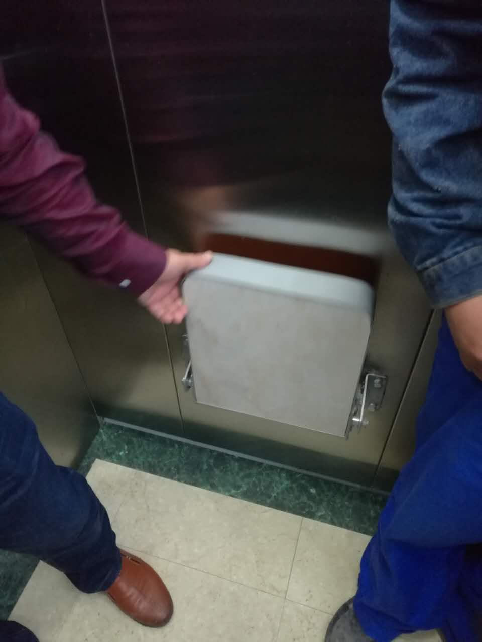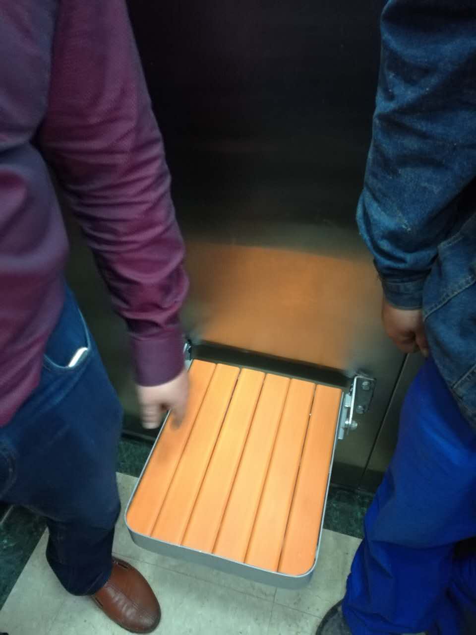 六) “人性化”――我们充分考虑了旧楼内老弱病疾人士的用梯需求,轿厢内的各个细节无不体现出对这些老弱病疾人士的关注与关怀。譬如说:轿壁上安装了扶手(一般情况下开云·电子(中国)官方网站的产品在电梯轿厢内一侧或三侧的轿壁上安装有扶手)、轿内可折叠式座椅(如下图)、轿厢内安装电梯专用空调(后二项均为选配功能)。这些功能的设置,大大地提高了老年人的乘坐电梯的舒适感与安全性。