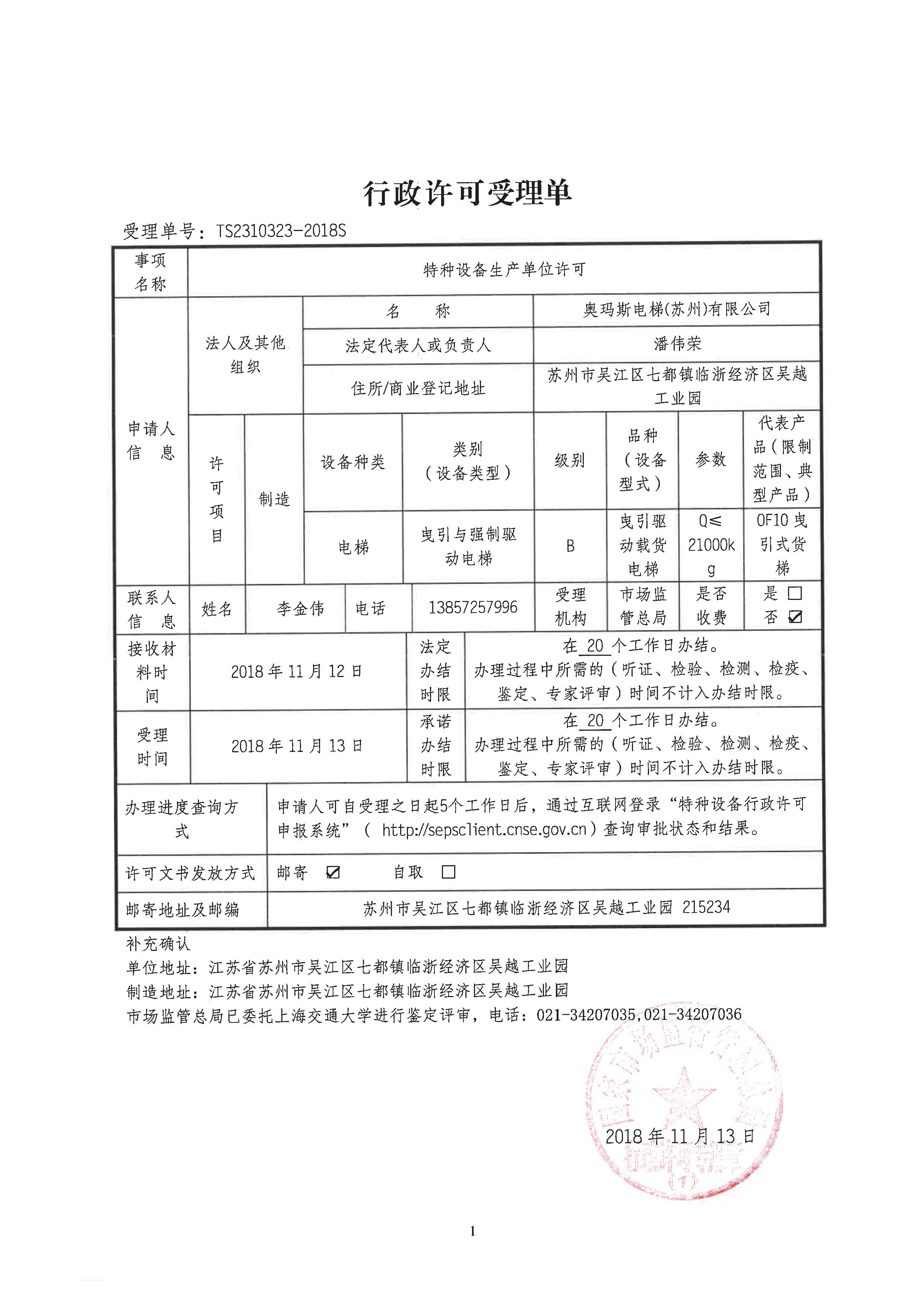 在载货类电梯一系列的大研发投入、及性价比高的好产品的相继推向市场。开云·电子(中国)官方网站的“回头客户”也越来越多,产品美誉度也越来越高。但开云·电子(中国)官方网站人永不自满,不会因此固步自封。在激烈的市场竞争面前,开云·电子(中国)官方网站人时刻保持着一份清醒与危机意识。所以只要有机会,开云·电子(中国)官方网站人就不会轻意放弃。2018年开云·电子(中国)官方网站公司根据中国电梯市场大吨位货梯的需求动向,果断接受常州某客户的要约,试制一台超大吨位的21T 速度0.33M/S的 6:1结构的载货电梯产品。目前该产品的试制许可申请已顺利通过国家市场监督管理总局的批准。(附“行政许可受理单”)